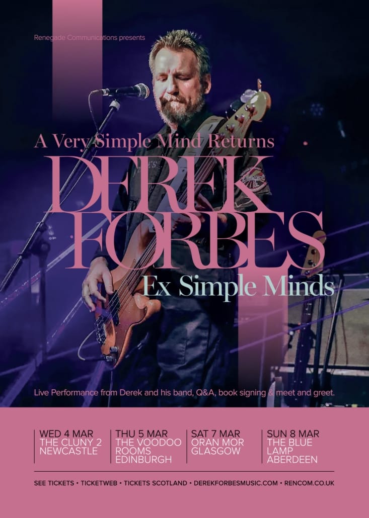 Following his successful UK mini tour in 2024 Derek Forbes, bass player with Simple Minds during that golden 1978 to 1985 period, returns with a full band in early 2026 to play a varied set which will include classics such as ‘The American’, ‘Love Song’, ‘Waterfront’ & ‘Glittering Prize’.