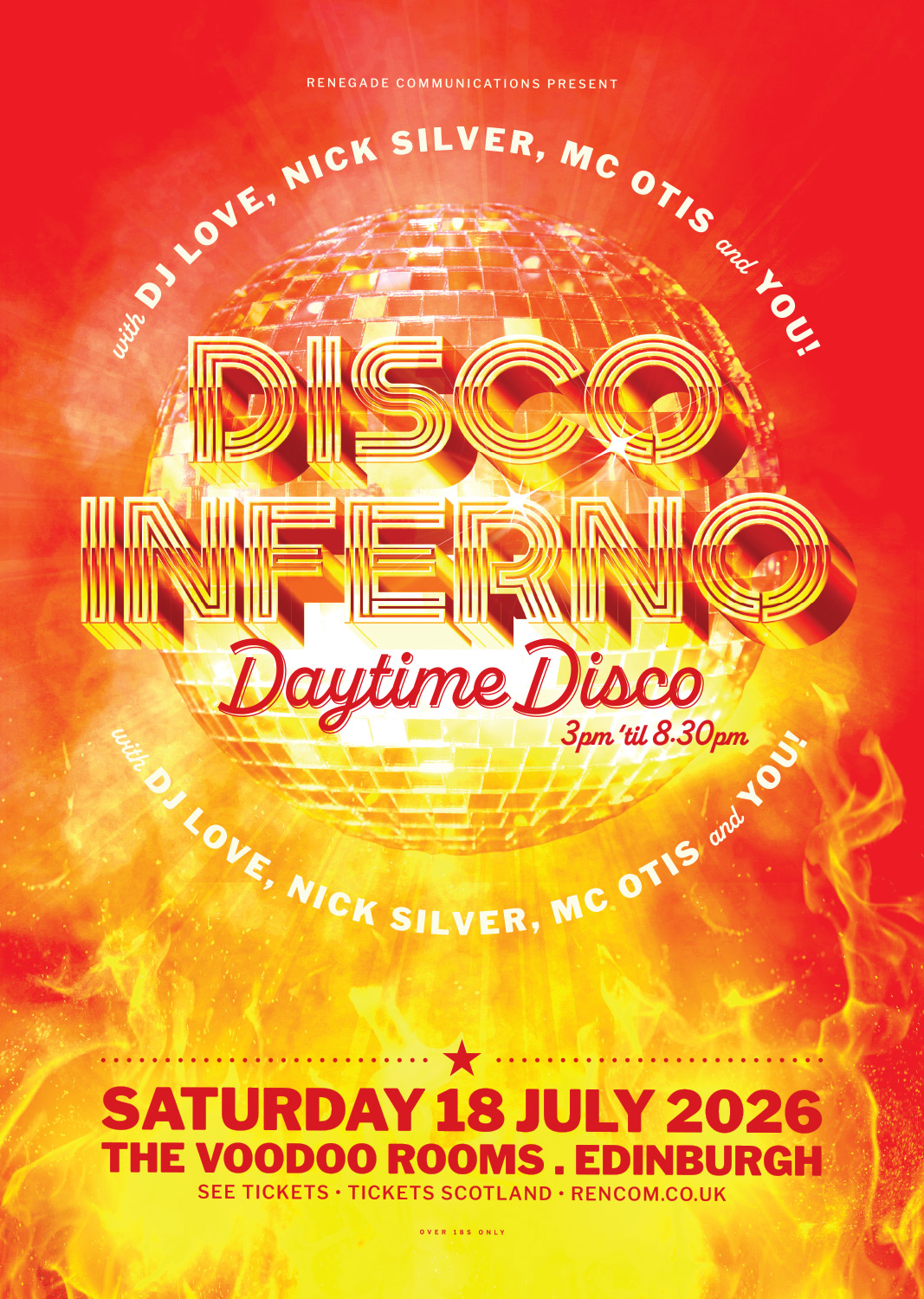 The original Disco Inferno team of DJ Love, Nick Silver and MC Otis have teamed up together once more to bring you an afternoon of delirious disco, fired-up funk, magical Motown and sanctified soul.