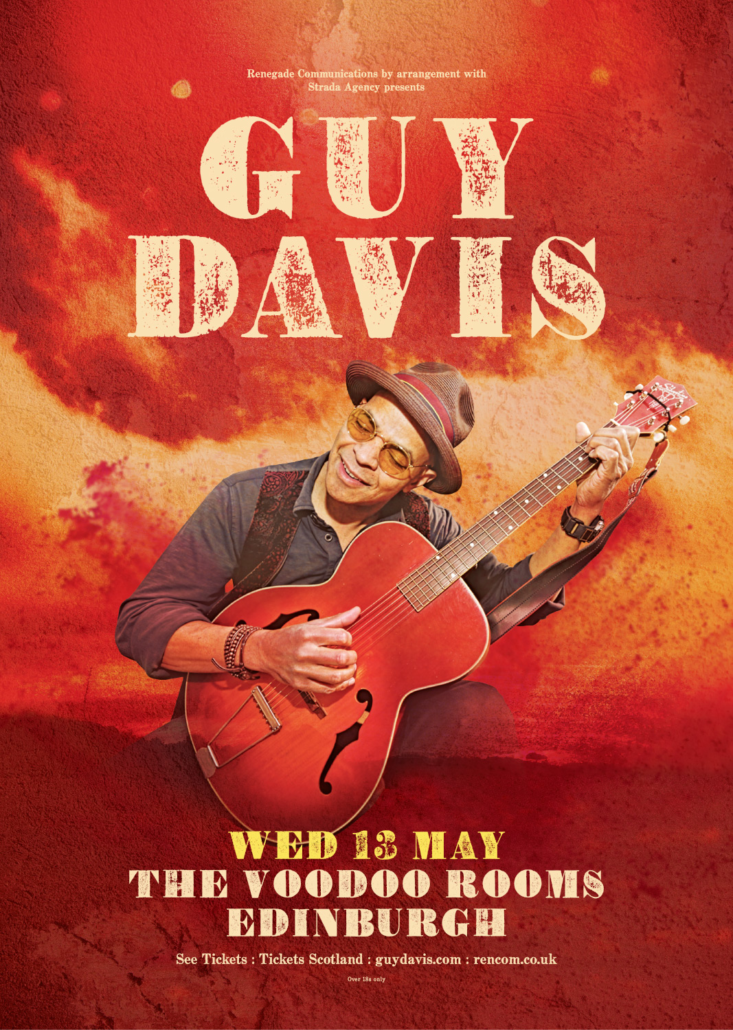 Equally at ease with six or twelve string guitar, five string banjo, harmonica, and even the didgeridoo, Guy’s work has seen him perform alongside Pete Seeger, Bruce Springsteen, Dr John, Taj Mahal and Joss Stone, opening for Chuck Berry, Joan Armatrading, and BB King, and perform all over the globe. Adventures that once saw him chased out of Red Square in Moscow for trying to sing, performing in the then Soviet occupied East Berlin, and in front of an iceberg in Greenland!
