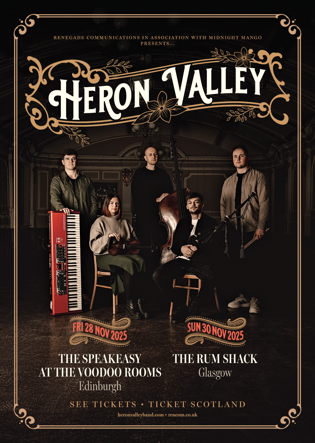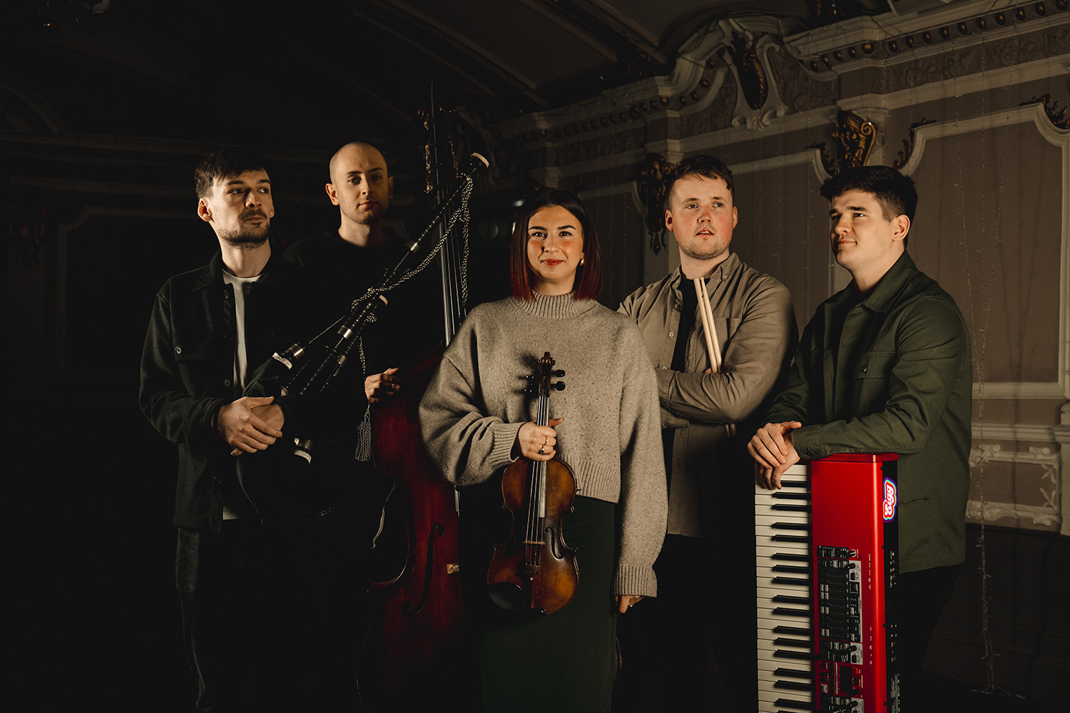 Formed in 2014, the group quickly gained attention for their lively stage presence and virtuosic musicianship. The band features a powerful line up of bagpipes, fiddle, guitar, keys, bass and drums seamlessly fusing driving rhythms, intricate melodies, and heartfelt lyrics together create a sound that is both deeply rooted in tradition and refreshingly modern.