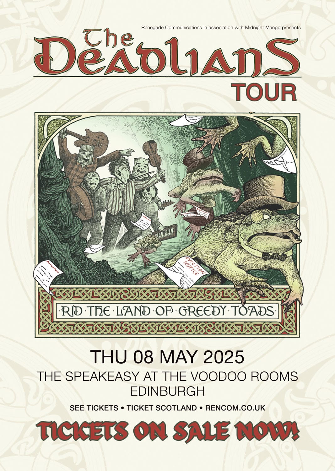 The Deadlians are Sean Fitzgerald (vocals, trumpet, fiddle), Barry Semple (drums), Tommy Foster (baritone guitar), Luke Farrell (synth), Eoin Campbell (bass guitar).