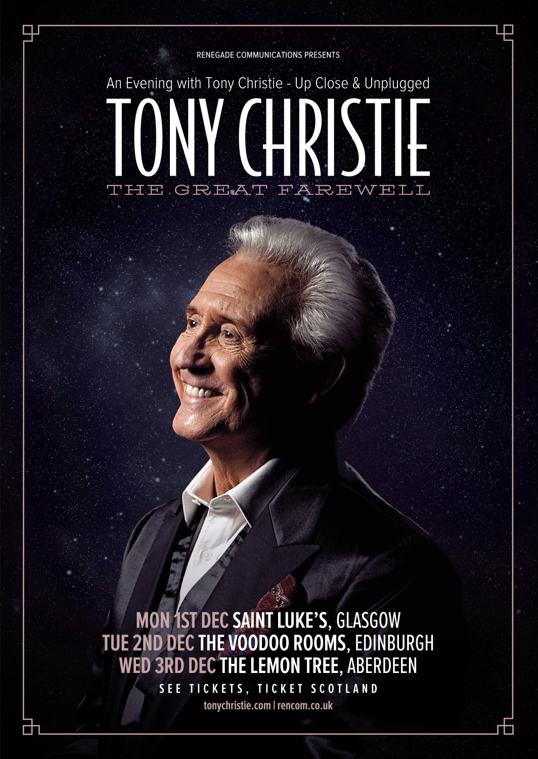 Tony performs tracks from across his career, from the trademark mega hit ‘Is This The Way To Amarillo’ through to other classics including ‘Avenues & Alleyways’, ‘Walk Like A Panther’, ‘Las Vegas’, ‘I Did What I Did For Maria’, ‘Solitaire’, ‘Happy Birthday Baby’, ‘Thank You For Being A Friend’ and many more through to some show stopping covers from the late greats that helped shape the career of the humble veteran from Yorkshire.