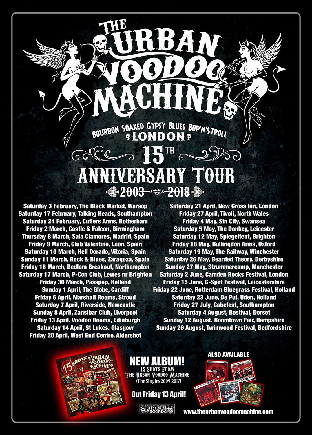 In 2008 The Urban Voodoo Machine opened for The Pogues on their American tour after a personal invitation from Spider Stacy, which in turn led to them being offered The Pogues full UK & Ireland X-Mas tour later the same year. The following year saw the release of their debut album ‘Bourbon Soaked Gypsy Blues Bop’N’Stroll’, on Gypsy Hotel Records. The album scored top reviews in all the major music magazines and made ‘Albums of the Year’ lists in Classic Rock and Big Cheese magazines. This was backed with lots of live shows and touring including headlining East London’s prestigious and beautiful Hackney Empire and joining the legendary New York Dolls on their UK tour.
